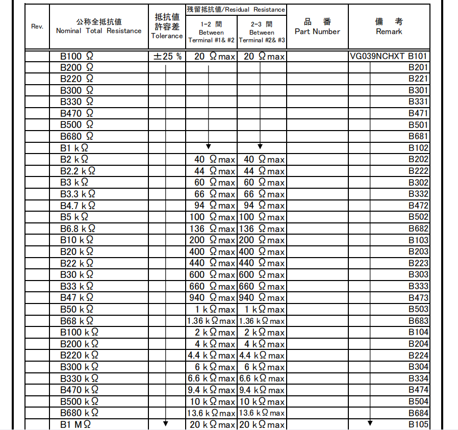 VG039NCHXTB102( 1KΩ) VG039NCHXTB105( 1MΩ) VG039NCHXTB203( 20KΩ) VG039NCHXTB301( 300Ω) VG039NCHXTB304( 300KΩ) VG039NCHXTB503( 50KΩ) |